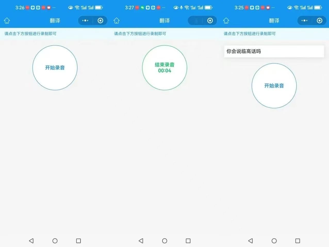 “海南临高方言语音识别系统”微信小程序界面(使用说明:打开微信小程序,点击“开始录音”,待文字变绿即可录音,录音结束再点击小圆圈即可显示语音识别结果)