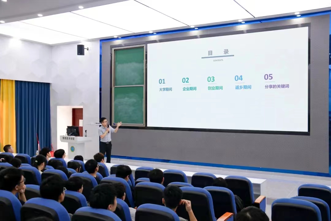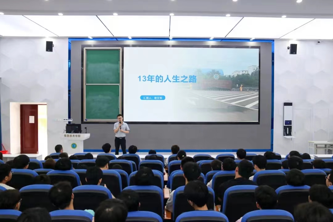 会议伊始,康东副经理向今天到来的优秀的员工谢艾军同学表示了热烈的欢迎,并介绍了他在校期间的优秀事迹、艰苦奋斗的创业精神和感恩母校的情怀。随后,谢艾军以“13年的人生之路”为主题,重点简述了自己在“大学期间、企业期间、创业期间、返乡期间”四个阶段的历程,并提出“勤奋 乐观 自省 聪明”八字建议,鼓励大家要有勇气和自信,在求职之路上展现自己最好的一面。