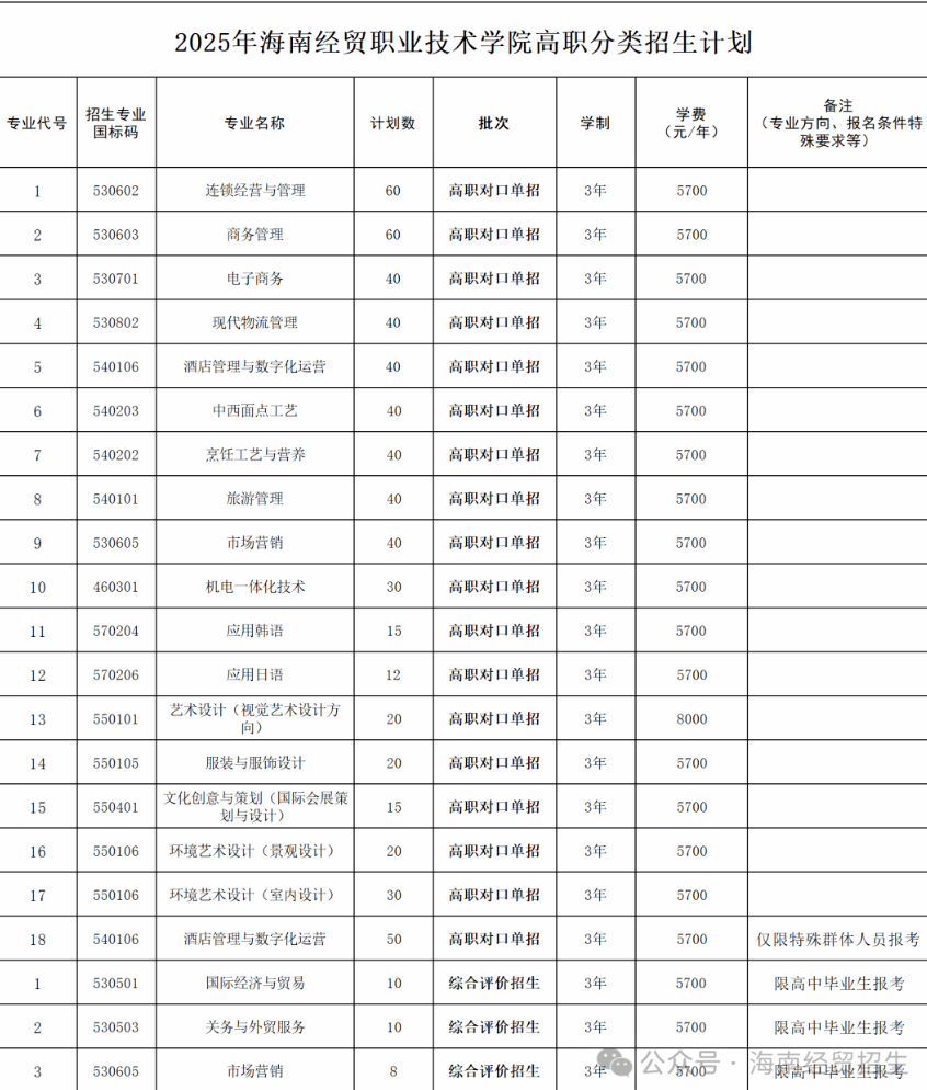 答:1.考生可在职业本科招生、高职(专科)对口单独招生和高职(专科)综合素质评价招生三个类别中选择其中一个类别报考,也可选择“职业本科招生+高职(专科)对口单独招生”或“职业本科招生+高职(专科)综合素质评价招生”的组合方式报考。考生在每个类别中可选报1所院校的1个专业。凭相关职业资格(职业技能等级)证书和获奖证书申请免技能测试或免试入学的考生,仅可以填报证书工种类别所涵盖的专业。2.考生在报名前要充分了解拟报考的公司及专业有关情况,审慎选择报考院校和专业,准确填报报名信息。考生所填写的毕业公司等信息必须使用规范名称,要认真核对本人姓名、身份证号码、近照等重要信息。因本人填报信息不完整、不准确、不真实所造成的相关后果由考生本人负责。报名信息公司初审通过后,不允许考生再修改信息。3.考生应在规定的时间严格按照图像采集规范及信息标准上传个人照片和报名相关材料。个人照片为考试、录取、入学、学籍注册、毕业审查等有关环节校对使用的重要图像,应使用考生本人近期(一般为报名年度内)正面免冠彩色头像的数字化图像文件。图像宽480像素*高640像素,分辨率300dpi,24位真彩色,文件扩展名应为JPG,大小40K左右。个人照片图像应符合《普通高等公司招生图像采集规范及信息标准》(见海南省考试局官网通知页面的附件4),可到照相馆拍照。考生所提交的材料必须齐全、真实、有效,对通过提供虚假材料骗取报考资格的,一经查实,取消其考试资格,已经录取的取消其入学资格,已经入学的由录取公司取消其学籍,由此产生的后果由考生本人负责。4.考生逾期未完成网上报名信息的填写和缴费等事项,视为放弃报名资格,考试费缴纳后不予退还。5.考生因参加2025年全国普通高考、省外高职对口单招等各类招生考试报名,造成重复报名或录取,无法通过录取数据审核并不能注册学籍的后果由考生本人负责。6.考生在报名注册时所设定的密码是登录报名系统填报和修改报名信息的依据,因个人保管不当、泄漏密码造成个人信息被公开、被利用、被篡改的,由考生本人负责。四、公司今年高职分类招生有哪些专业?计划数多少?学费及住宿费多少?答:公司2025年高职对口招生专业(含方向)有18个,特殊群体人员(下岗失业人员、农民工、新型职业农民、退役军人)限报指定的专业。综合评价招生的专业有3个,分别是国际经济与贸易、关务与外贸服务、市场营销。高职对口招生计划数为612个,综合评价招生计划数为28个。收费标准严格按省财政厅、教育厅、物价局规定的收费标准执行,学费5700元/学年(艺术设计专业8000元/学年);住宿费1050元(6人间)/学年;教材费根据实际使用量收取费用。公司高职对口招生专业、计划及收费标准详见下表。