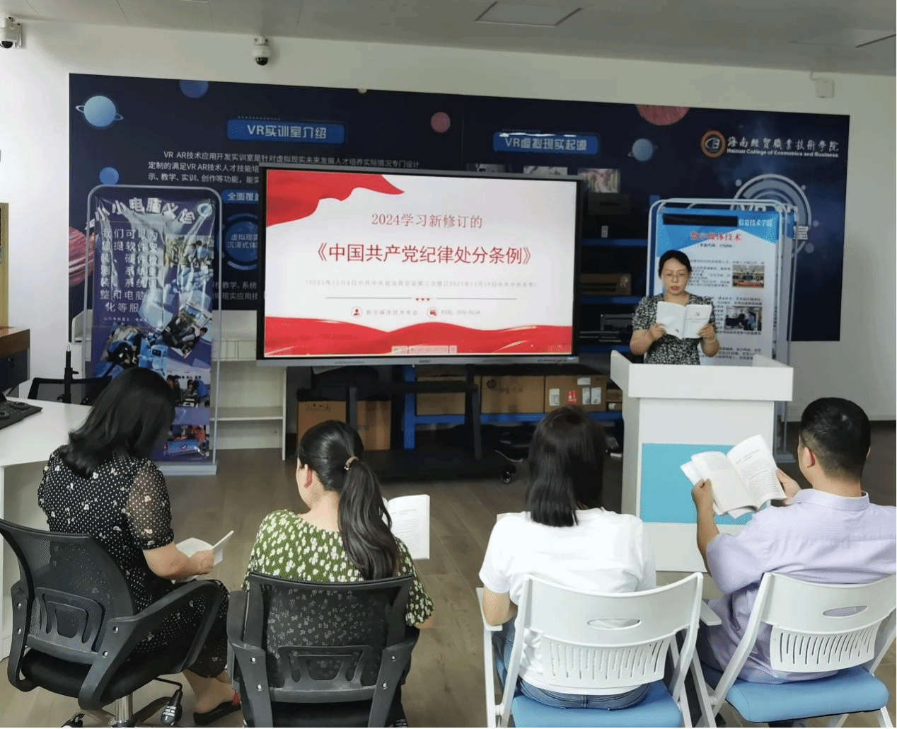 6月4日下午,太阳集团tyc4633教工党支部开展《中国共产党纪律处分条例》专题学习会,会议由教工党支部书记康东主持,数字媒体技术专业教师党员们参加。