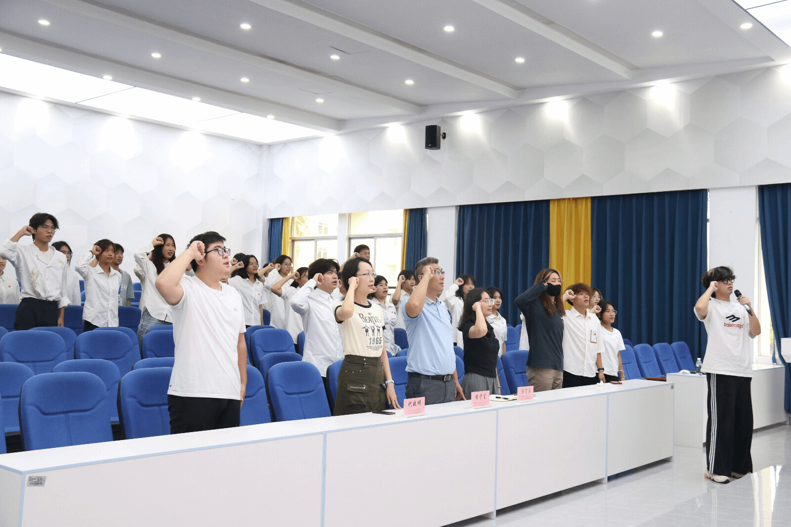 在领誓人郭云飞的带领下,全体团员共同举起右拳,庄严宣誓,誓言坚定有力,表达了全体团员对共青团的热情和奋斗的决心。