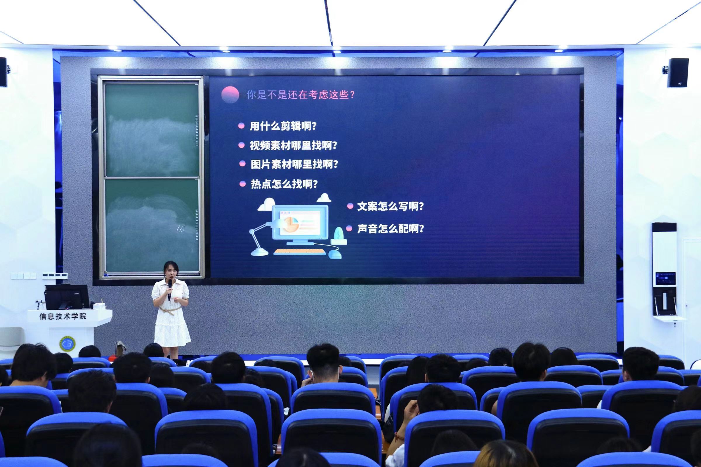 讲座伊始,王倩老师通过提问的方式列出同学们就自媒体普遍关注的话题,如用什么软件剪辑、哪里找视频和图片素材、如何找热点和文案以及如何配音等,之后引出本次讲座的主题“自媒体入门——必备软件合集”。王老师分别从视频剪辑类、修图软件类、设计排版类、写作文案类、数据分配和运营学习类、办公和图片素材类、热点资讯类自媒体依次推荐相对应的软件app。讲座中,王老师通过剪影、一言等app进行现场演示讲解,使同学们清晰地了解到自己的需求和适用的软件。最后,王老师以“自媒体博主计划”为题,讲述基础入门四个阶段,让同学们了解成为一名自媒体博主,是日益积累、循序渐进的过程。讲座最后,王老师就搭建个人账号、发布时间、主题脚本、视频拍摄技巧、新手剪辑技巧等问题与现场同学进行互动交流,讨论,同学们纷纷表示受益匪浅。