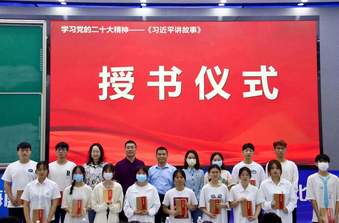 会议第三项,员工党支部书记代晓明老师、21级辅导员蔡守正老师特为公司入党积极分子开展《习近平讲故事》授书仪式。