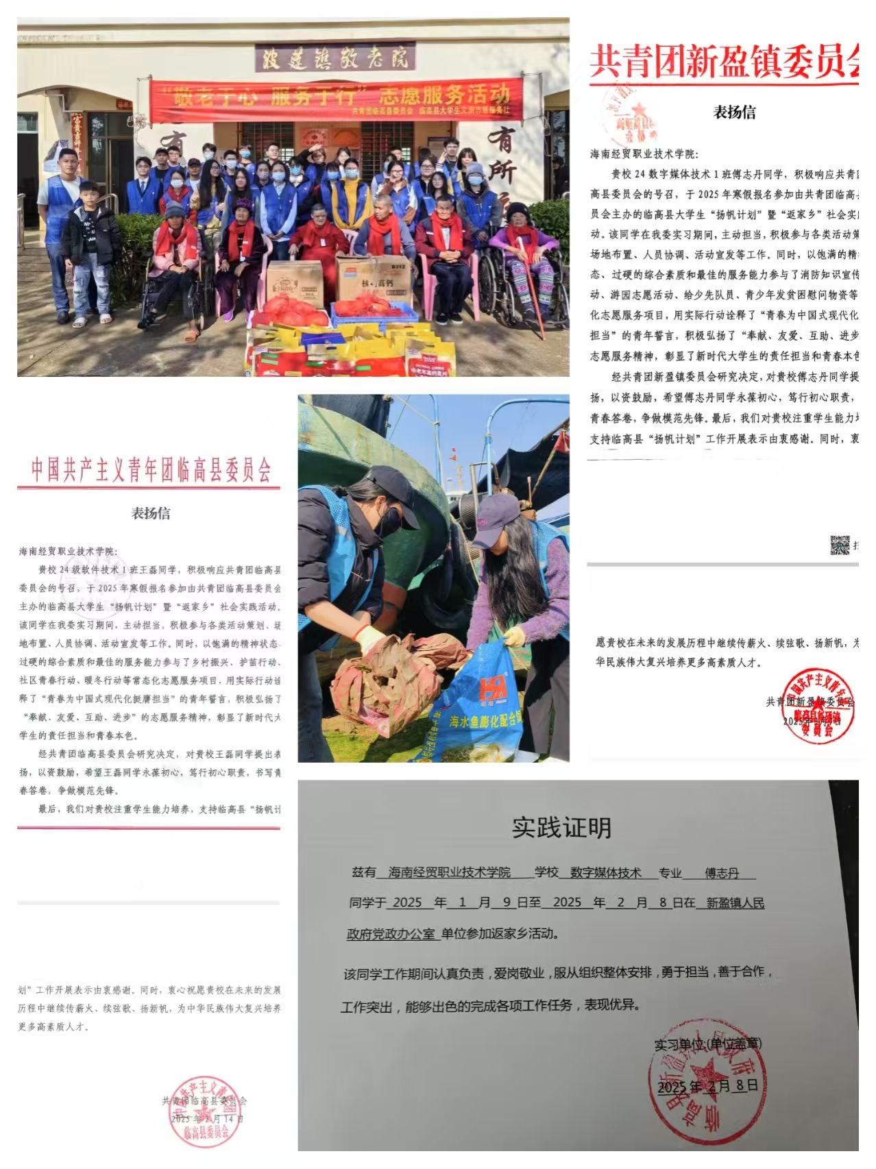 24软件1班王磊同学在团临高县委实践期间,主要负责活动的报名信息收集与录入、文件对接与修改、活动进度汇报等工作。“虽然每天要处理大量表格和文件,但想到这些工作能为大家提供服务,就觉得特别有意义。”王磊认真细致的工作态度获得了共青团临高县委员会的表扬信肯定。除了完成日常工作,王磊还积极参加了临高县旅游与文化广电体育局、东英镇人民政府和耕读山房举办的“2025年慢城乡音赶海音浪节”、共青团临高县委员会联合各乡镇开展的“笔墨迎春、福满新春”送春联志愿服务活动、团临高县委联合相关单位开展“敬老于心,服务于行”志愿服务等活动。“每当看到乡亲们参与活动时绽放的笑容,我就真切体会到了这份工作的意义与价值。”王磊动情地说道。