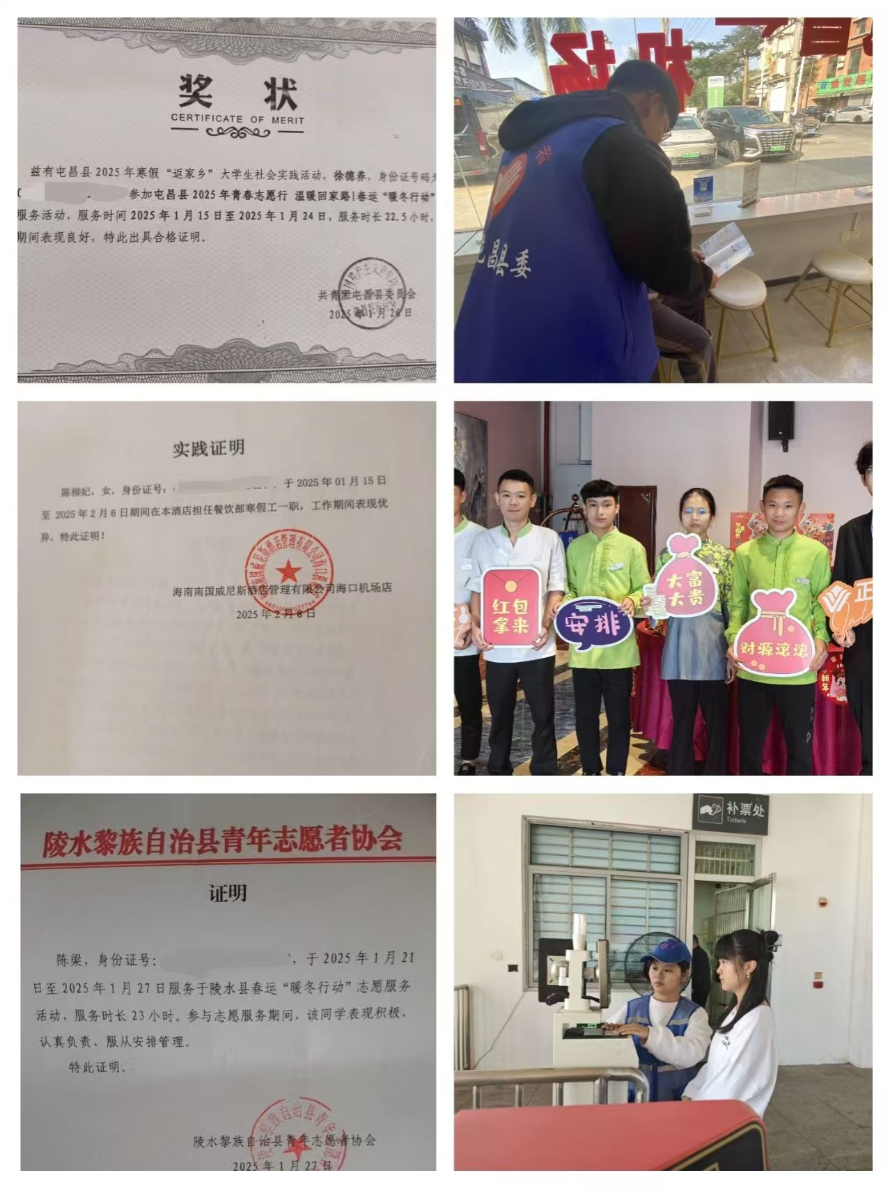 24软件1班徐德养同学积极参加了屯昌县2025年寒假“返家乡“老员工社会实践活动,投身“青春志愿行 温暖回家路|春运““暖冬行动“志愿服务活动。在汽车站服务期间,徐德养主要负责旅客咨询指引和票务协助工作,耐心解答乘客各类出行问题,特别关注老年旅客等特殊群体的需求,为他们提供贴心的引导服务。工作间隙,他还主动与其他志愿者一起开展安全知识宣传活动,通过发放宣传资料、现场讲解等方式,向群众普及防艾、防溺水等安全知识,提醒大家在假期期间注意出行安全。“能够用自己微薄的力量帮助返乡旅客顺利回家,感觉特别有意义。”徐德养表示,这次志愿服务经历让他深刻体会到基层工作的重要性,也增强了他服务社会的责任感和使命感。
