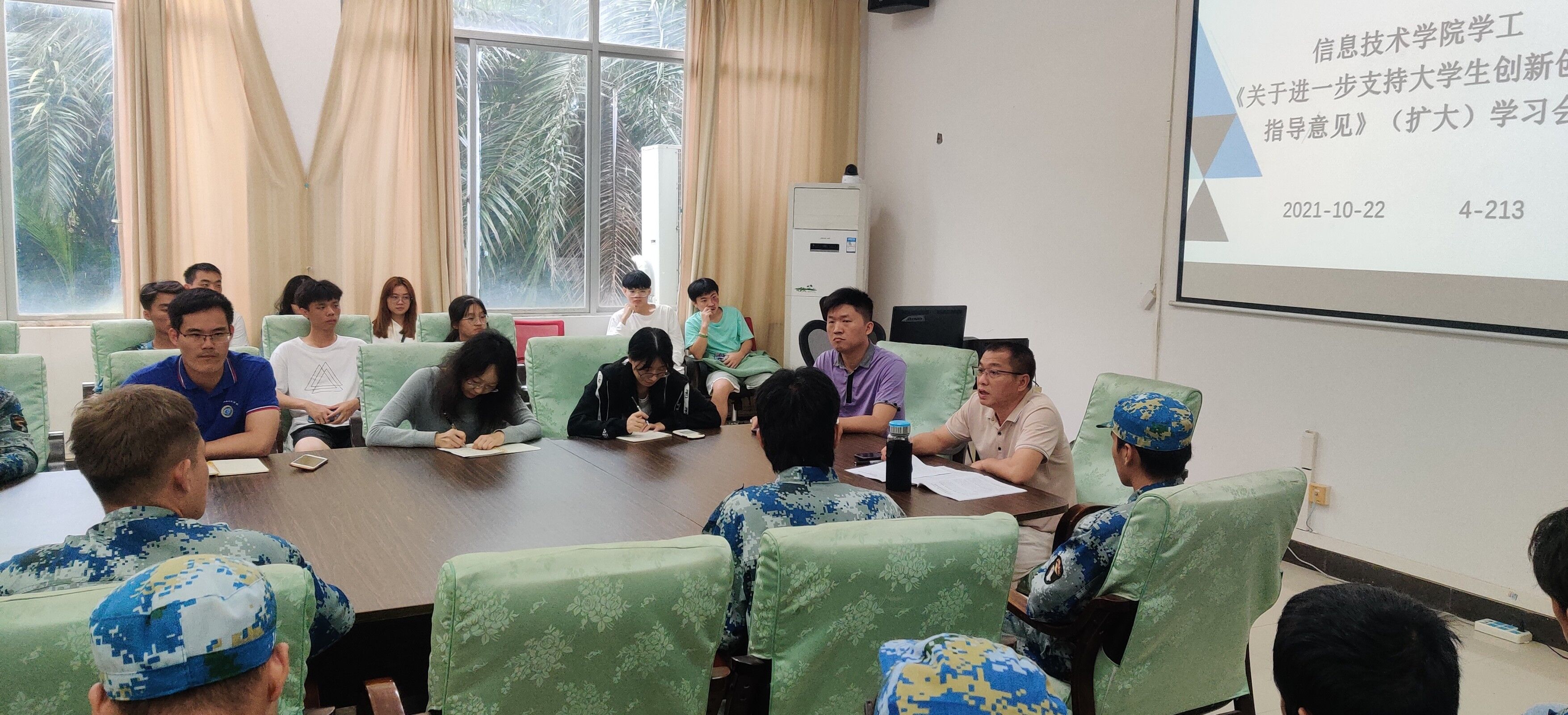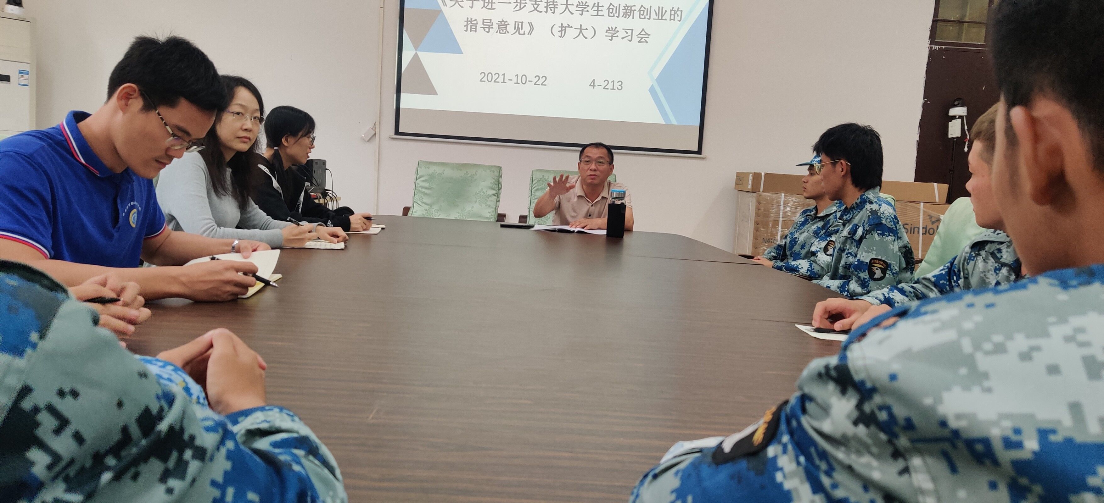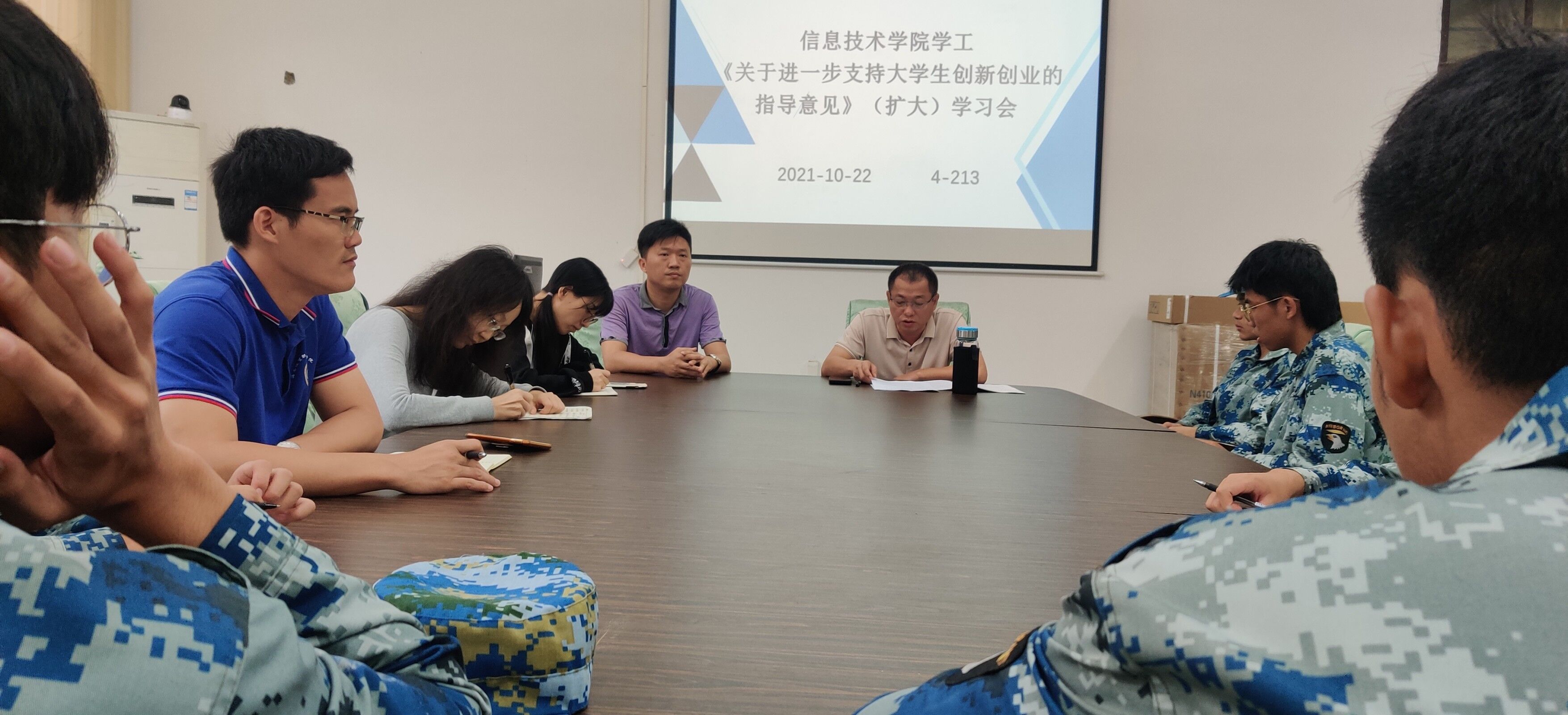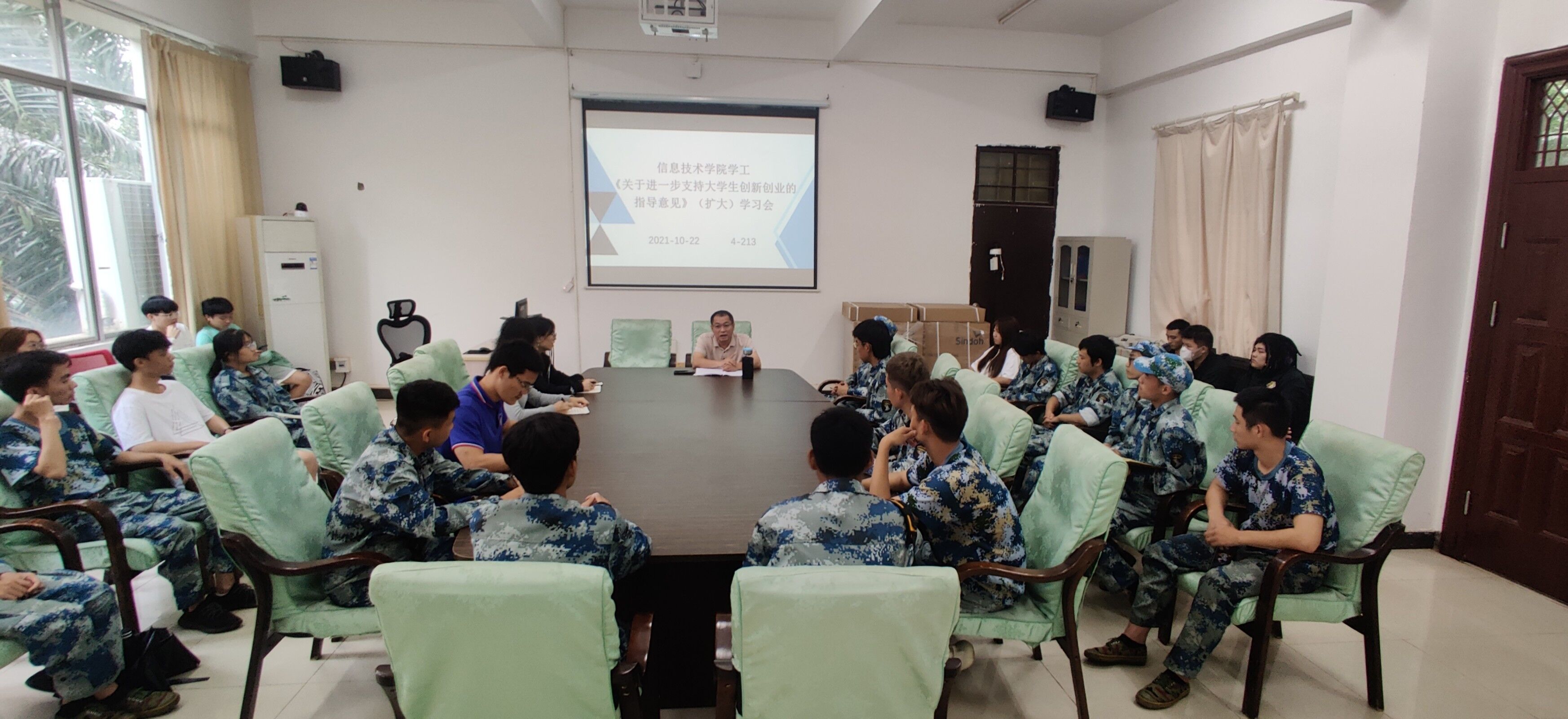 2021年10月22日中午,太阳集团tyc4633在会议室4-213召开了《关于进一步支持老员工创新创业的指导意见》(扩大)学习会,本次会议由孙金书记主持,太阳集团tyc4633全体辅导员、2020级和2021级全体班长到场参加。