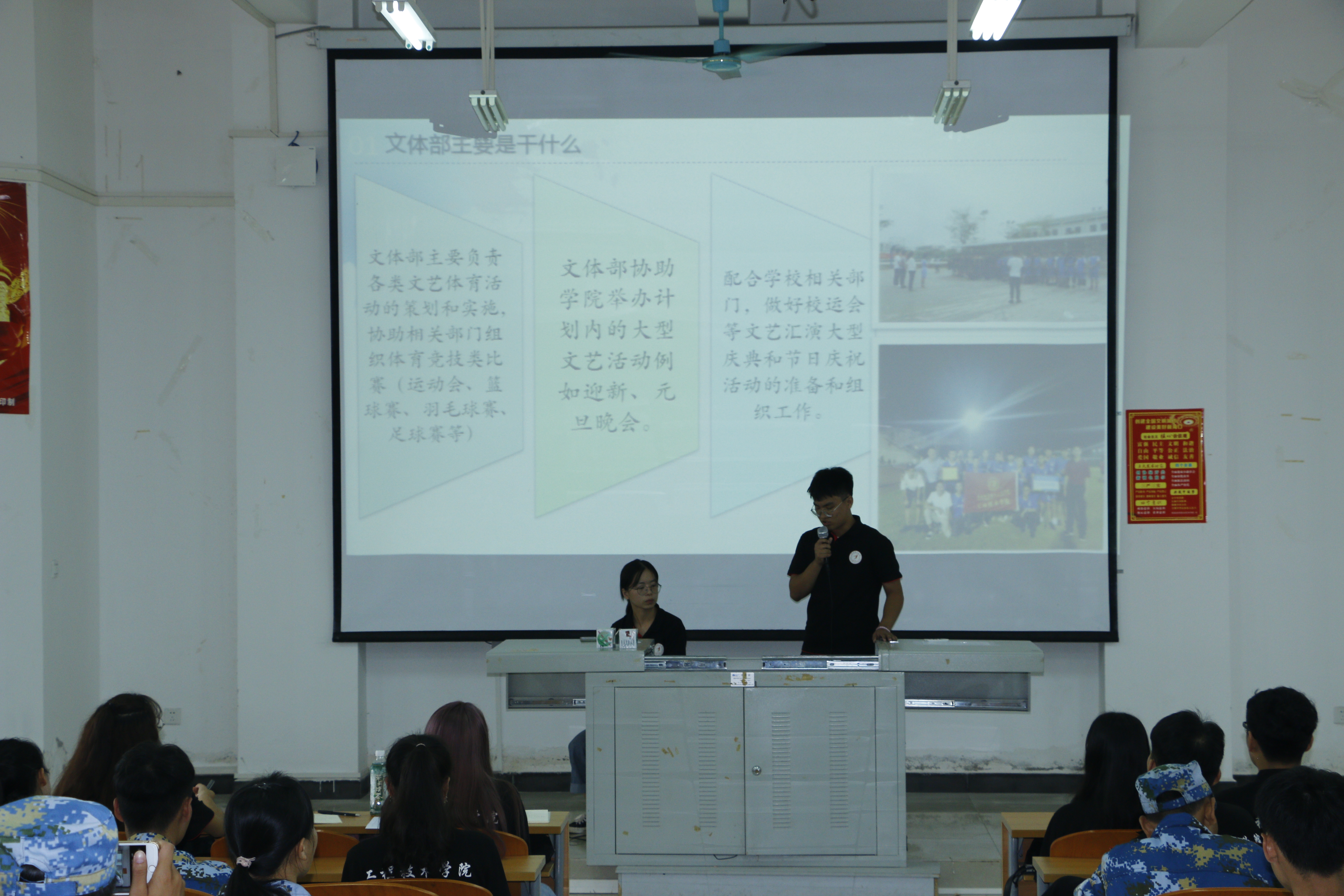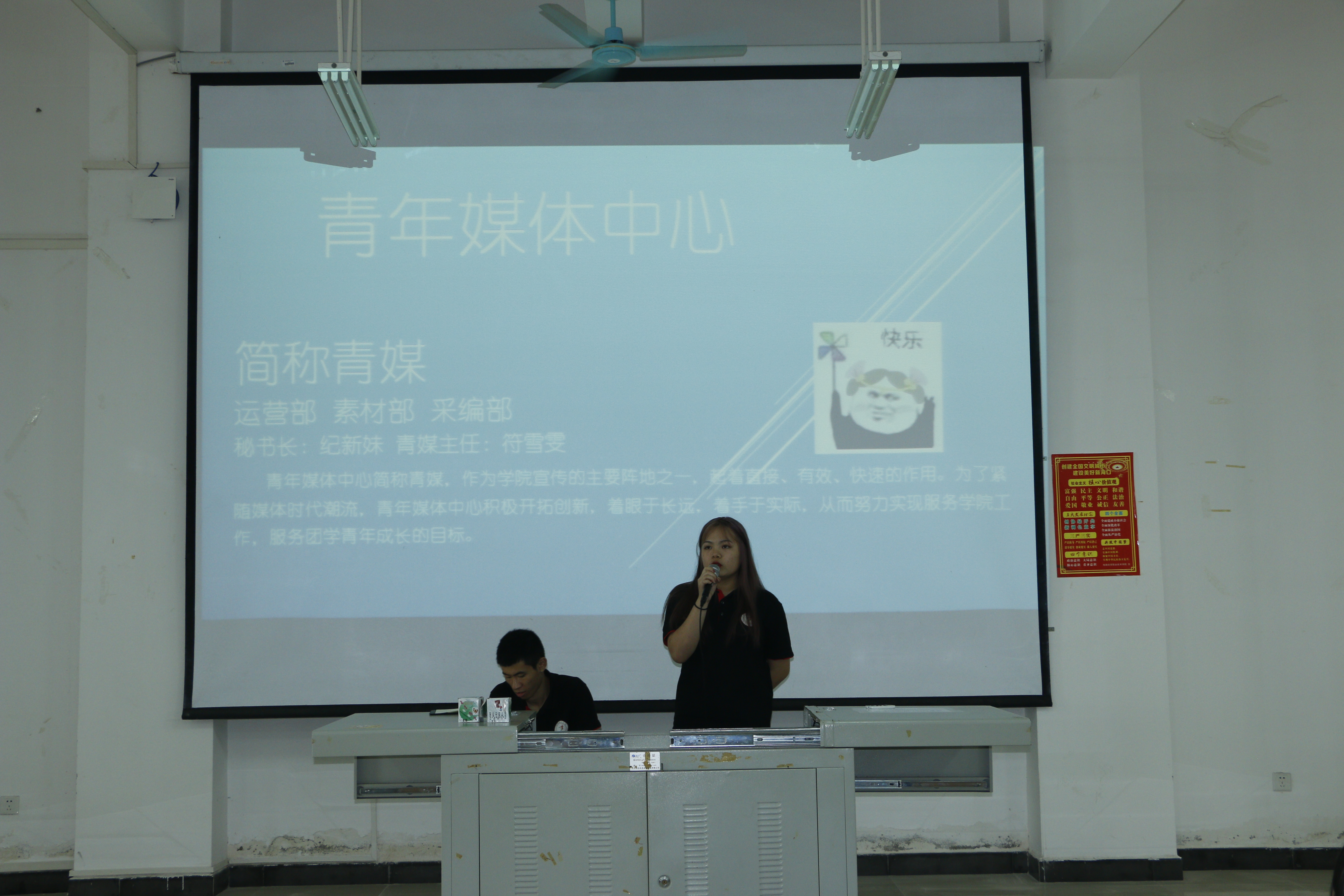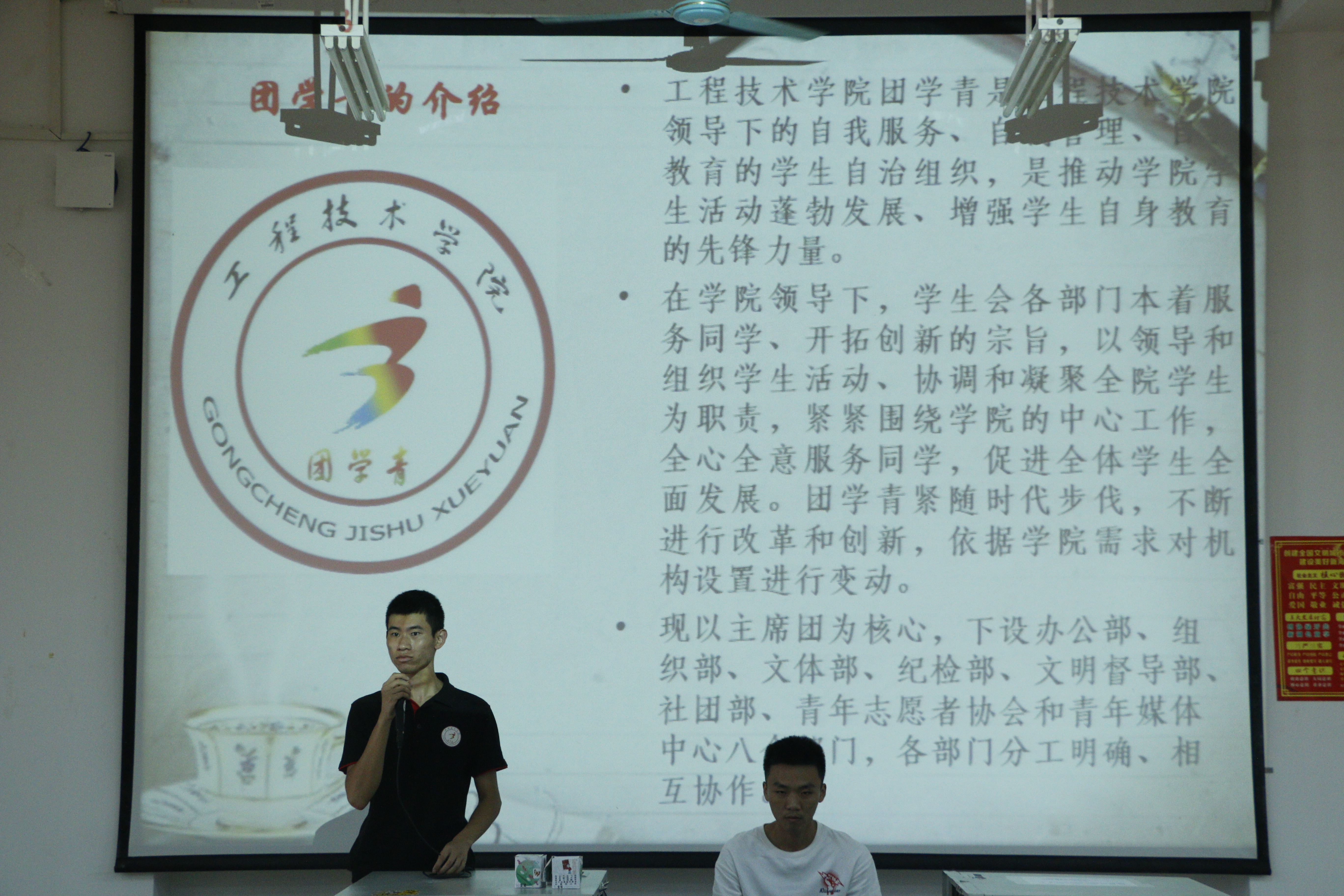 会议的开始由团学青主席叶俊男介绍团学青,随后各部门展示准备好的PPT介绍自己部门。介绍的结束,主席叶俊男介绍各部门的面试地点。面试时,同学们都普遍指出在员工会可以得锻炼,结交朋友,能够在团学青这个平台提升自己的能力,在大学里充实自己。同时各部门也准备不少问题来考验同学们,部分同学的回答也使部长们非常满意,使招生会议高潮不断。