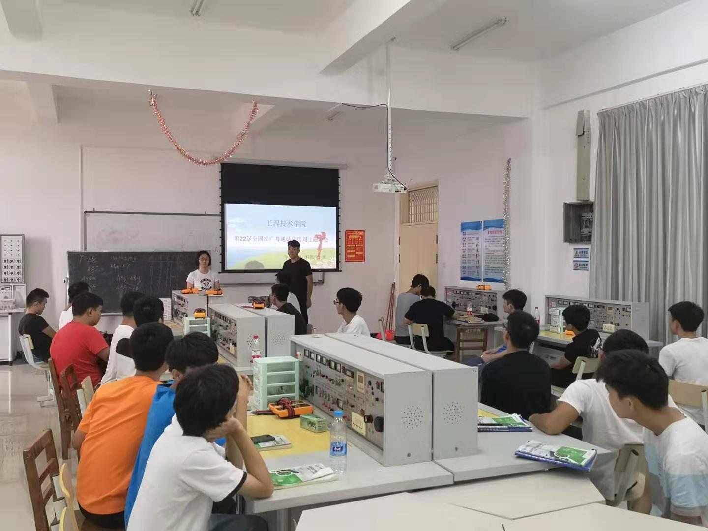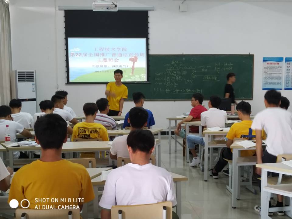 2019年9月29日(院青年媒体中心报道)讯,2019年9月16日—22日是第22届全国推广普通话宣传周。为全面落实国家语言文字的方针政策和法律法规,加强全体员工的普通话,传承发展中华民族优秀传统文化,9月29日,工程技术公司2018级各班成功组织开展推广普通话宣传周主题班会。