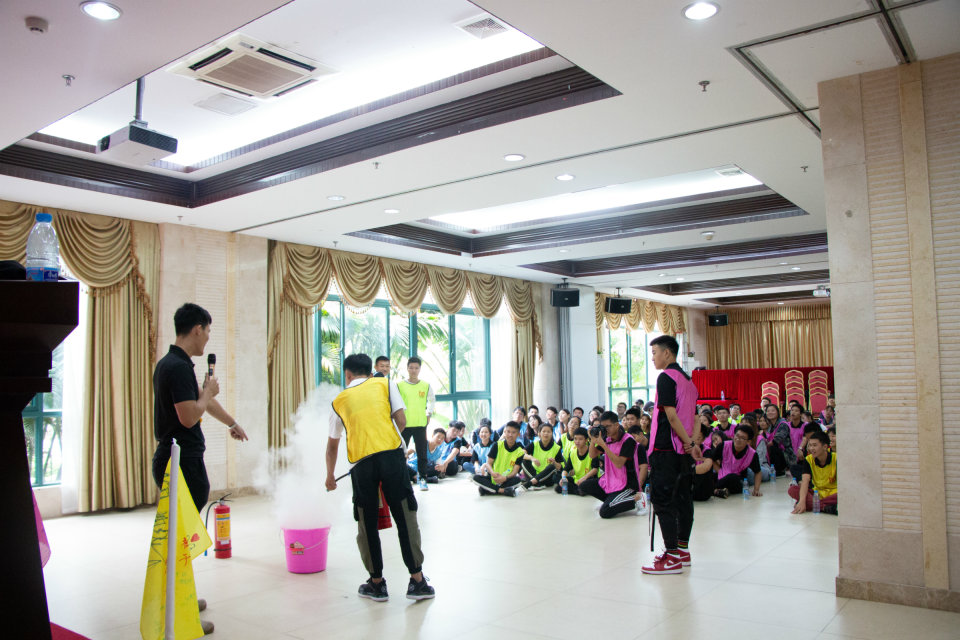 上午九点整,参加培训的学员准时在会议室集合,工程技术公司梁其钰老师对本次学习的目的和预期的目标作了简要说明,周恺老师强调了本次学习的纪律,接着梁老师带领所有学员对培训目标达成及纪律要求进行宣誓。为了充分调动学员的积极性,梁老师将在场的学员分成四组,并引入竞争机制,对团队协作项目能量传递、勇争先锋进行小组PK,有的小组在制定策略、团队沟通、任务执行上表现出色,分数领先,有的小组在执行力上有所偏差,分数相对落后,但所有小组都认真总结成功或不足的经验,并进行分享,相互的学习和交流产生了火花的碰撞,每个小组每个队员保持着最佳的战斗力。小组PK后,唐图老师对所有学员进行消防知识的普及,唐老师引用老员工使用违规电器导致宿舍失火的案例,迅速吸引了每位学员的注意力,接着实地演示灭火器的正确使用方法,部分学员学习并亲自体验了正确使用灭火器的流程,随后进行了安全消防知识竟答。