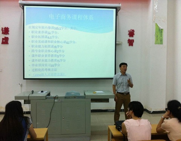 本次会议主要为2014级新生详细介绍电子商务这个专业,同时给大家指明三年的学习课程及方向,让同学们对电子商务专业进一步了解,使同学们对未来的就业有一个明确的方向,对将来充满信心。每一位同学都聚精会神的听取老师细心讲解,讲解他们不理解迷茫的地方。单老师还讲述了电子商务的前景以及我们系对专业的重视,并详细的介绍了我们系部,以及我们专业参加省赛及国赛的情况和成就。专业介绍完成以后单老师带领2014级新生参观系办公室和系实训室基地,对专业实训内容的加以介绍。