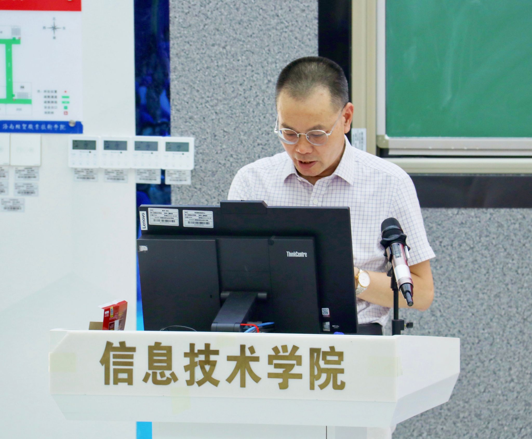 数字媒体技术专业董阁副教授作为教师代表发言。他以阅兵精神激励新生:个人成长与国家发展同频共振,选择信息技术,就是选择与未来对话,他叮嘱新生四个要做,常去图书馆、坚持锻炼、合理使用网络、养成良好习惯,并希望大家在未来三年锻炼专业能力、团队能力、坚韧品质,用代码书写青春,用智慧创造未来。