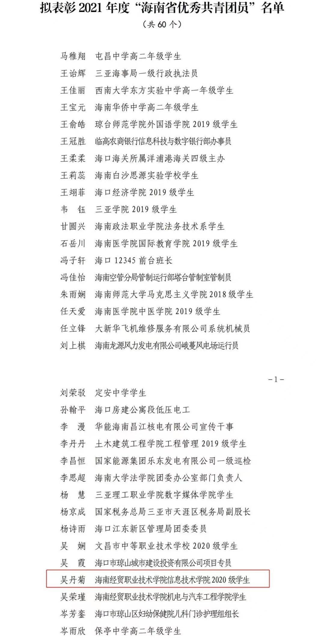吴丹菊是20级软件技术1班的一名共青团员,现担任班长、学工办助理。大一学年总成绩排名专业第一,获得“国家励志奖学金”、“三好员工”、“优秀共青团员”、“优秀青年志愿者”等荣誉称号。学业优异的她,也不忘提升综合素质,2021年荣获“外教社·词达人杯”全国英语老员工高职组二等奖、第六届服务项目大赛优秀奖。此外还参加了2021年泛珠三角老员工计算机作品海南省赛暨“讯飞杯”(高职高专组),荣获二等奖。她用勤勉踏实的工作,默默无闻地奉献,走出了一名共青团员的奋斗轨迹。